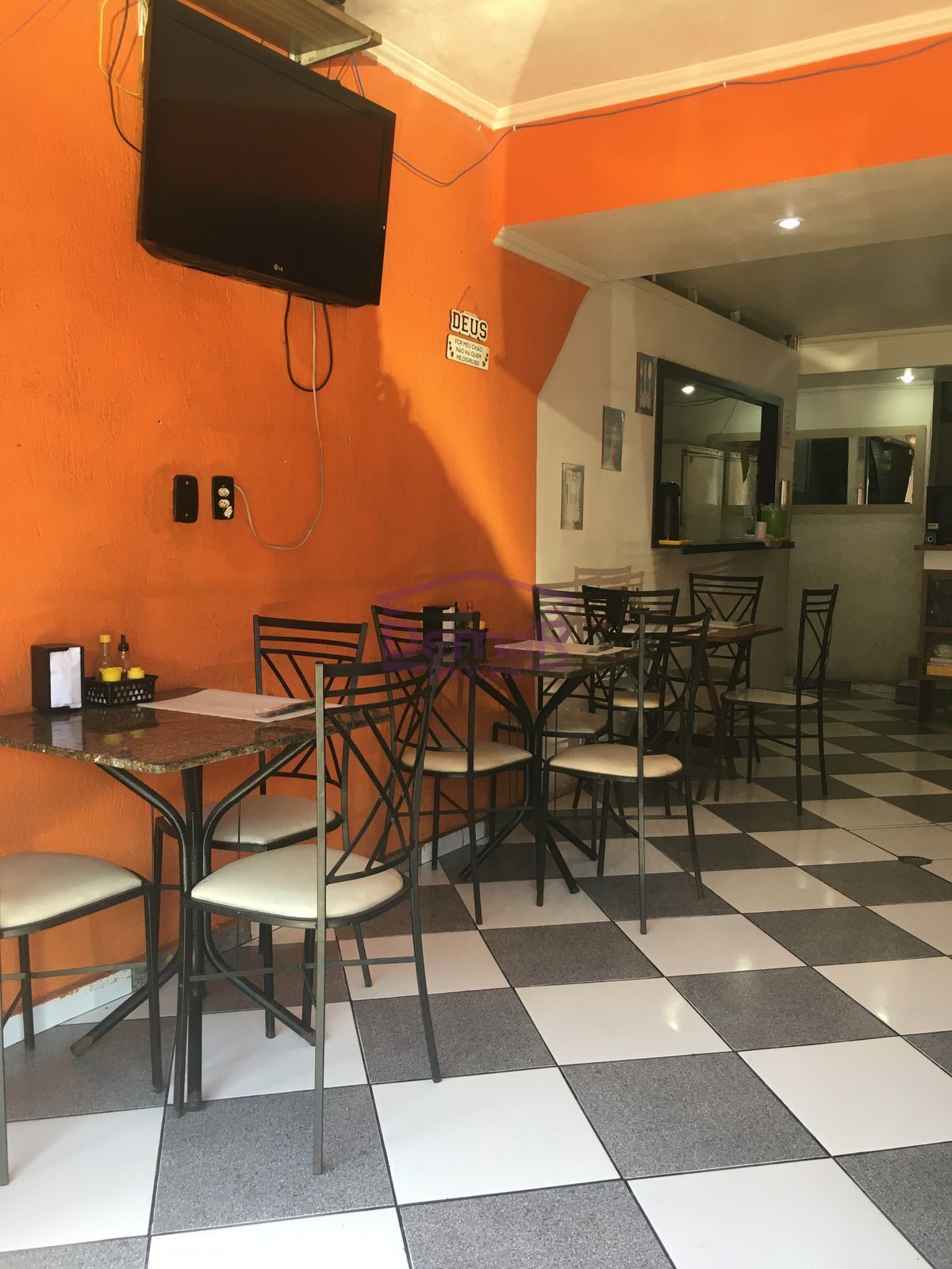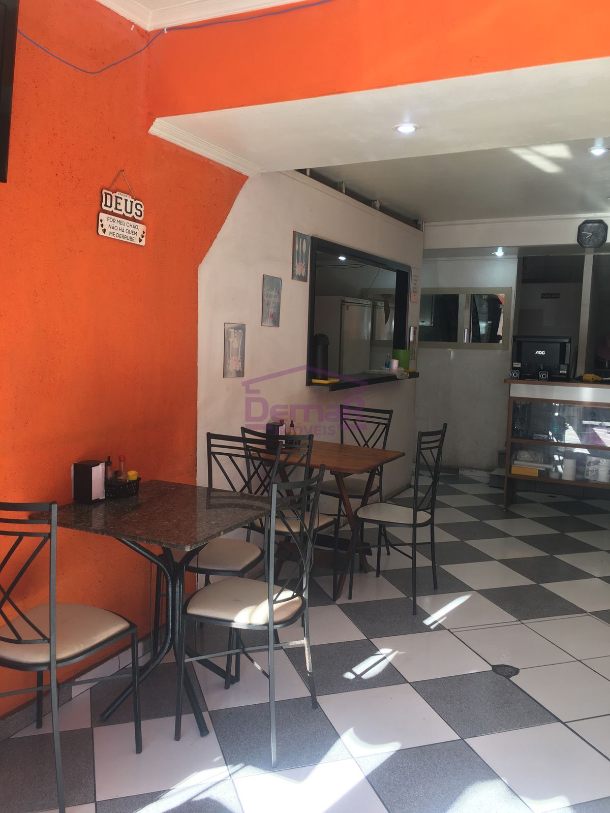 Fica: Geladeira, freezer, fogão, fritadeira, expositora, mesas e cadeiras, cozinha equipada, balcão e computador.